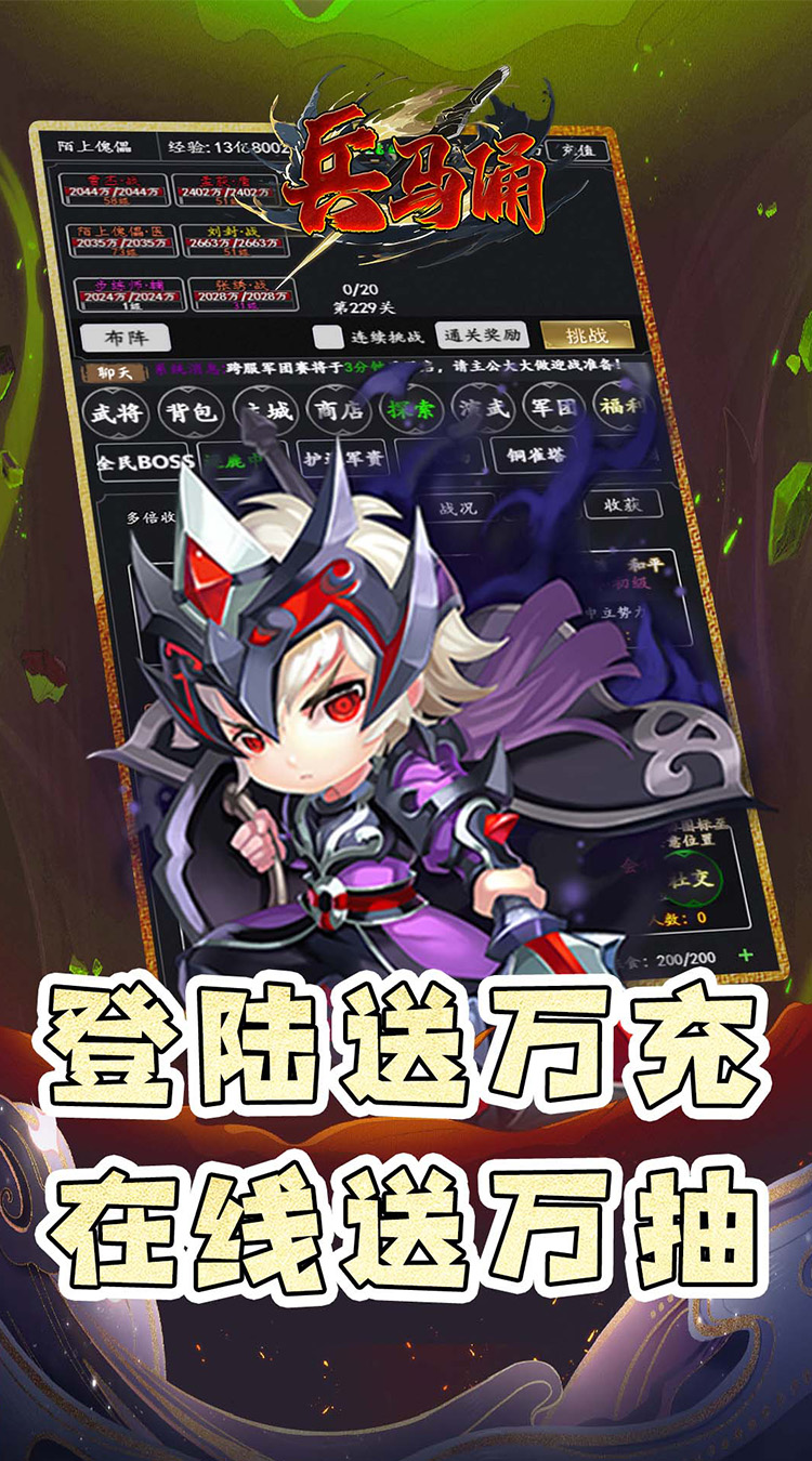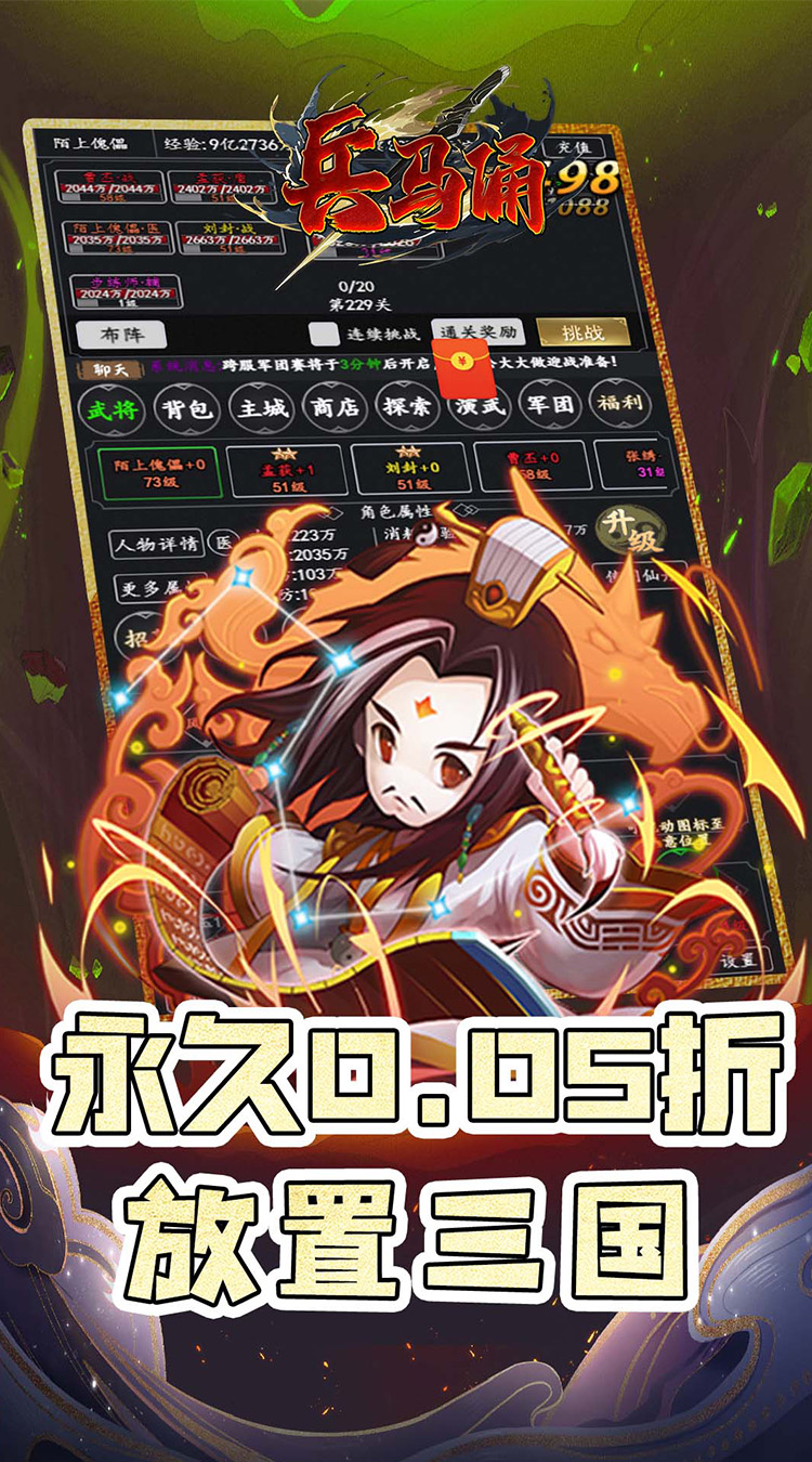 1、全场永久0.05折、上线送10W民心、100武将招募令、100W元宝、500W银两、500W经验